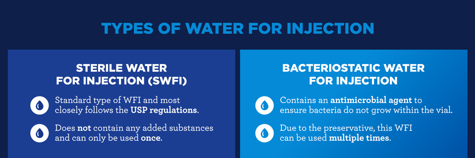 - Bacteriostatic Water for Injection: Bacteriostatic water is manufactured with an additive. It contains an antimicrobial agent to ensure bacteria do not grow within the vial. The antimicrobial agent is the main difference between the bacteriostatic and sterile Water for Injection. Due to the preservative, this WFI can be used multiple times.